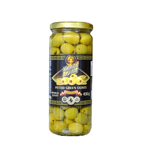 Information: Latino Bella Pitted Green Olives are green olives that have been pitted, pickled, and packaged in a jar. The product weighs 450g. Green olives have a mild salty flavor, a crisp texture, and a distinctive taste.